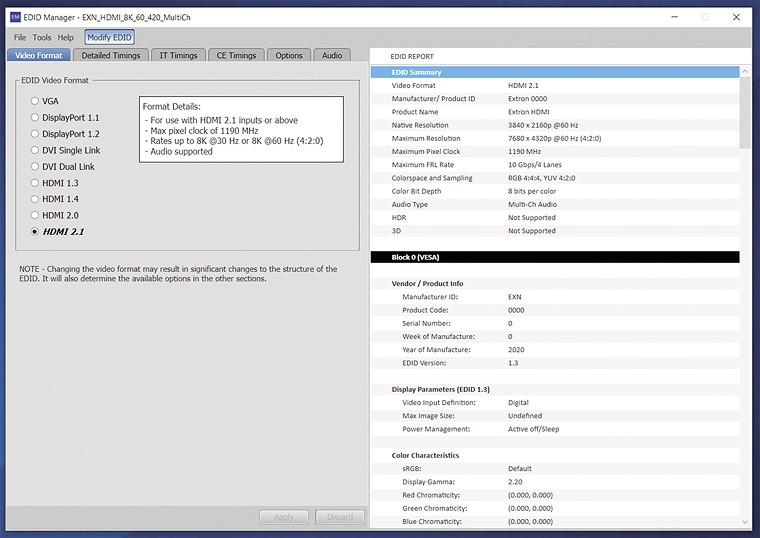 The new EDID Manager 2.1 is designed to facilitate display device management and help with troubleshooting possible compatibility issues between the display and the source. It lets you examine, modify, and create display EDID data, including video rates, color space, sampling, color bit depth, audio capabilities, and overall video format. The software provides all of the same features as earlier versions as well as many enhancements. Convenient capabilities include support of resolutions up to 8K and today’s higher refresh rates. It also accommodates a wide range of audio formats, including recent and popular releases by Dolby® and DTS®. EDID Manager 2.1 works in conjunction with other Extron software such as PCS and XTP® System Configurator, offering access to user-modified EDID to connect and transfer custom EDID to Extron products.
