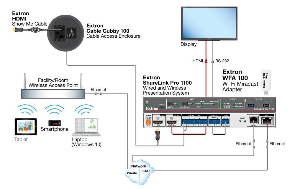 Extron ShareLink Pro 1100 and ShareLink Pro 500 enable anyone to present wired or wireless content from their computers, tablets, or smartphones onto a display for easy collaboration. They feature streaming technology that supports simultaneous display of up to four devices, including an HDMI-connected device, and dynamically update the display layout as new content is shared or removed. The HDMI input supports wired connections from any connected source in the room. To support a wide range of environments, ShareLink Pro has collaboration and moderator modes that facilitate both open and controlled environments. When used with Extron GVE – GlobalViewer Enterprise software, multiple units can be managed across an enterprise or campus. ShareLink Pro’s professional capabilities provide easy integration of AV and mobile devices into meeting, huddle, collaboration, and presentation spaces.