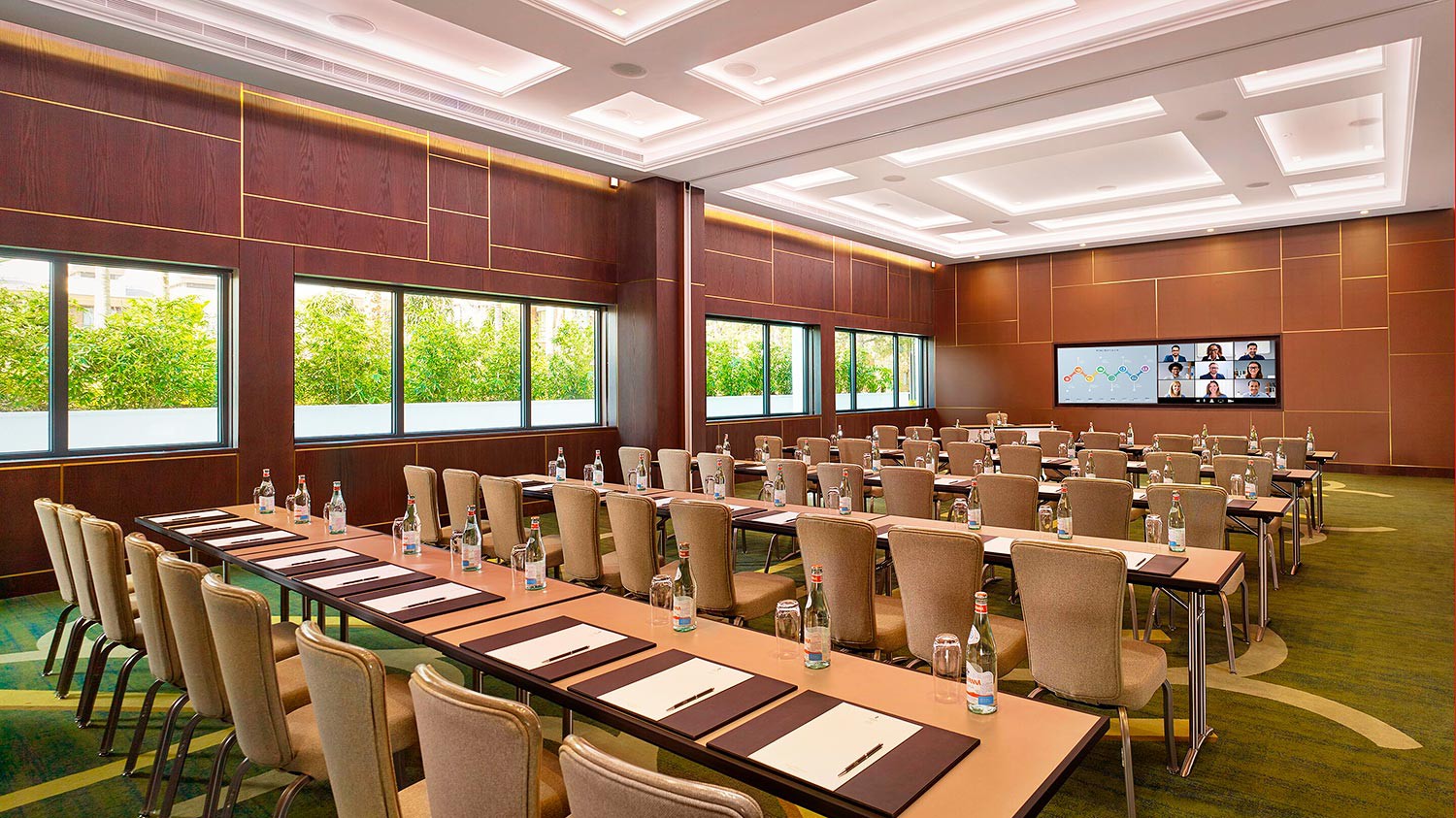In the large ballrooms, two TLP Pro 1720MG touchpanels work with an IPCP Pro 550 control processor to adjust audio levels and switch program sources on every projector around the ballrooms. They also integrate with the MA lighting system that controls 170 DTS lighting fixtures across the ballrooms. Extron systems also control the projectors, screens, shades, and functional room lighting. The AV sources in the meeting rooms are routed by the DTP CrossPoint 108 Matrix Switcher, which sends the selected signal to two screens. A wall mounted TLP Pro 1022M touch panel works in conjunction with an IPCP Pro 350 control processor to offer intuitive control for the lighting, temperature, and shades. The meeting rooms are divisible and automatically route the local inputs to the local projector and provide the appropriate control in each part of the room.