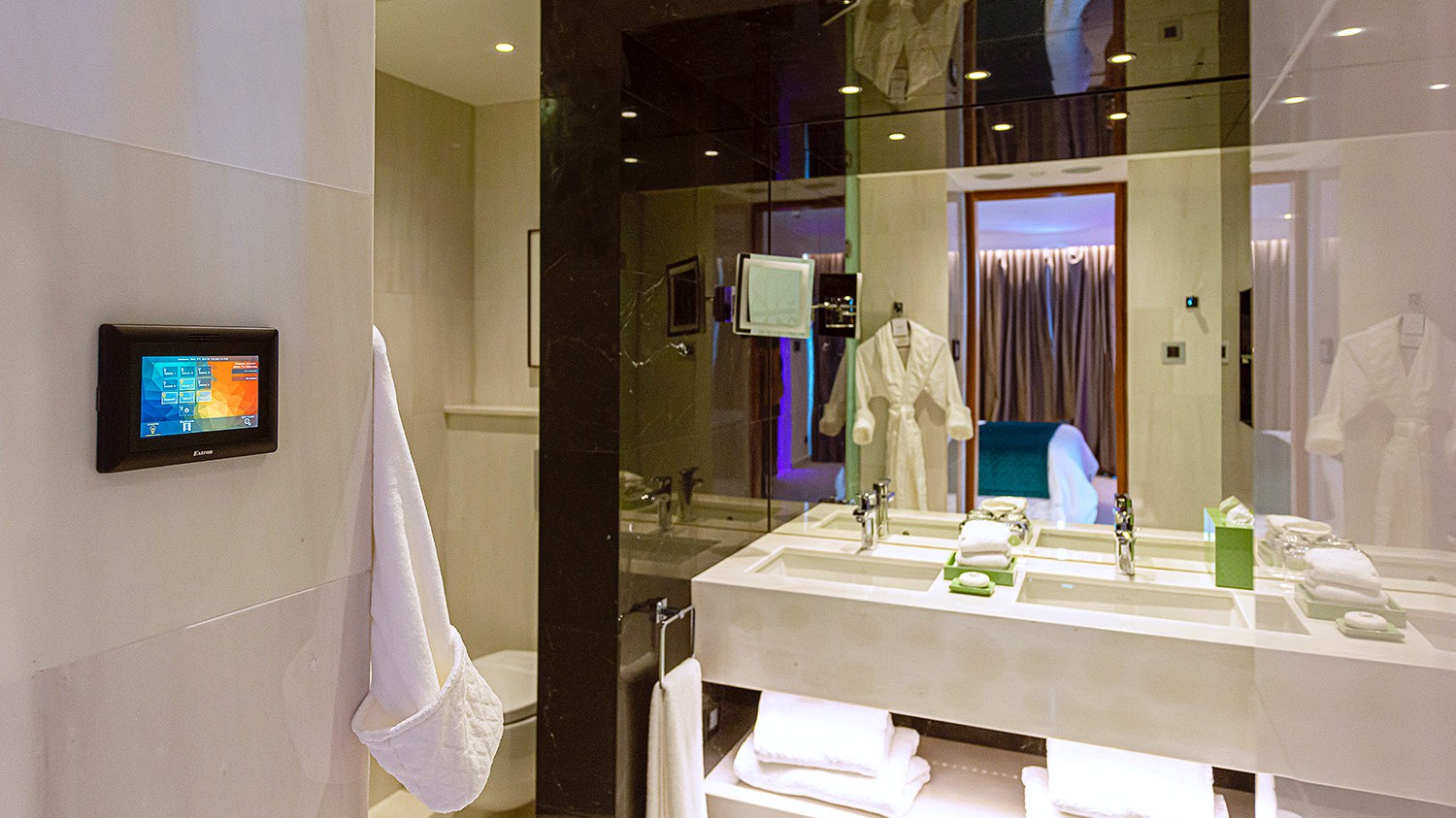 Offering up to three bedrooms, a private pool and other exclusive amenities, the villas are the premiere resort accommodations. Each villa features up to 14 touchpanels that provide convenient access to control throughout the living spaces. From an aesthetic point of view, the elegant styling of the TouchLink Pro touchpanels was of key importance to support the luxury image of the hotel. There are TouchLink Pro touchpanels at the bedside to control the curtains, in the kitchen to control the lights, and in the living room to control lights and request room service. The touchpanels in the bathrooms control programmed chromotherapy modes. The calming effects of chromotherapy, or color therapy, are programmed to reflect individual moods for superior relaxation while bathing or showering. In some rooms, a window within the bathroom wall allows the rainbow of colors to shine through, bringing the tranquil lighting effects into the main room.