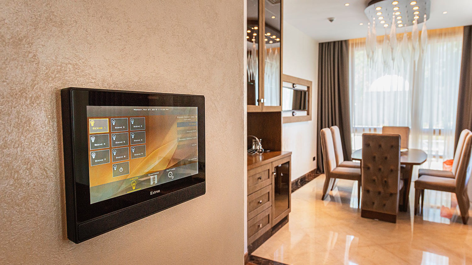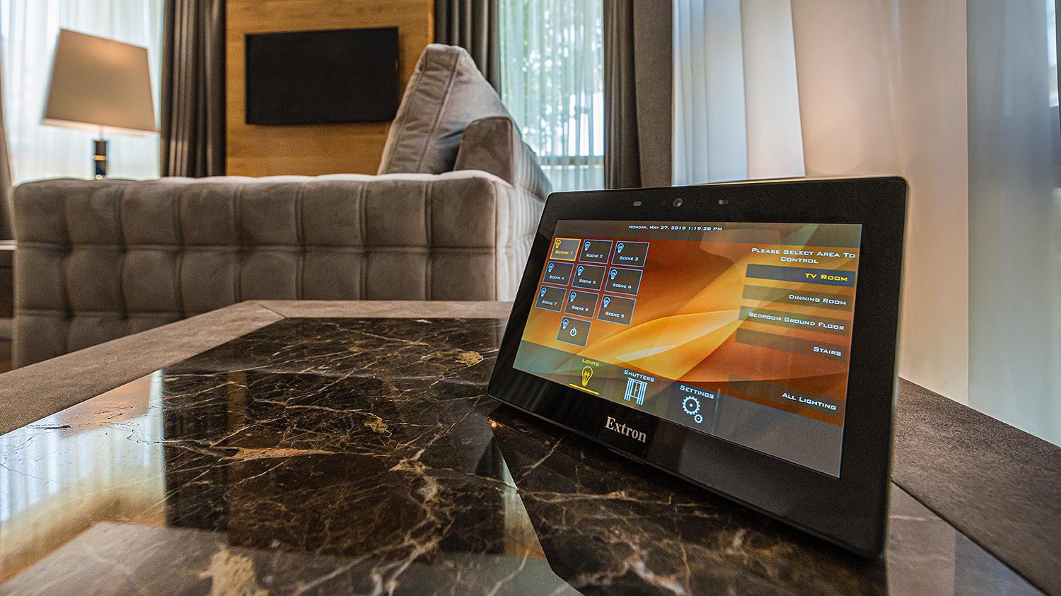 Designing an AV system that would meet operational requirements in the villas and hotel common areas was somewhat challenging because of the number and variety of in-room devices and systems that required control. Extron control systems had to integrate with the building management system, lighting systems, and hospitality systems including room service and housekeeping. This high level of system integration required a control system that was very flexible, easy to configure, and was able to interface with many different protocols, such as digital inputs, KNX, DMX, relays, IR control and more.