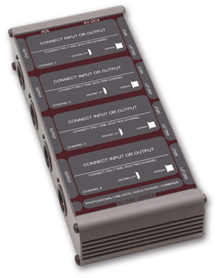 The four channels allow multiple uses for the AV-DC4. A single mono audio source can be divided to feed one, two or three mono equipment inputs. A stereo source can be combined to mono, feeding one or two mono equipment inputs. A mono source can be divided to feed a stereo equipment input (left and right). A stereo source can be combined to mono and simultaneously be divided to feed the mono signal to both the left and right inputs of stereo equipment. Ground lift may be selected individually on any of the channels.