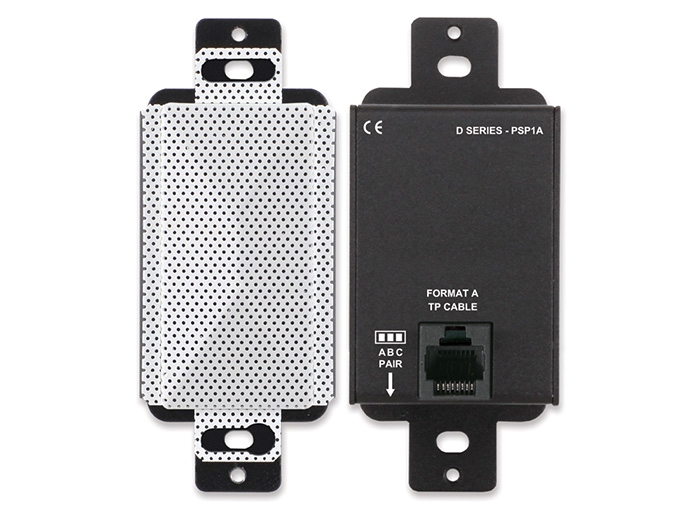 The D SERIES-PSP1AF is a compact active loudspeaker that delivers rich, detailed sound in Decora-compatible wall or chassis mounts. It is a single-pair audio amplifier module compatible with RDL Format A twisted pair products. The PSP1AF receives audio and 24 Vdc power through a rear-panel RJ45 jack. A rear-panel switch set during installation determines which of the three FORMAT-A pairs is amplified. Amplification is provided by a high-efficiency Class D power stage with audio filtering tailored for crisp, pleasant audio clarity. The high-efficiency Class D output stage produces negligible heat for all levels of expected voice or music modulation. The amplified output level is set by the installer using a volume control located behind the speaker grill. The PSP1AF includes an analog compressor/limiter that makes higher average sound output levels possible without clipping.