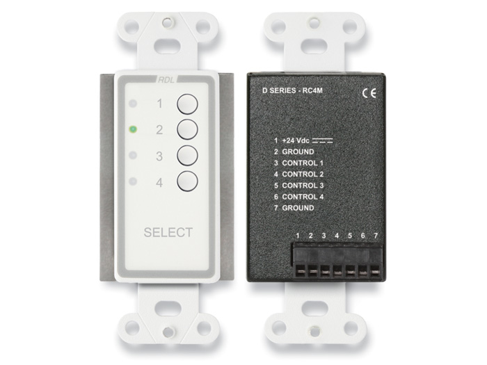 All the D SERIES-RC4M features combine to make it the ideal choice for single point or multiple location remote source selection in high quality systems. Use them with RDL source selection modules, or side-by-side with other RDL remote accessories as part of a complete audio/video system.