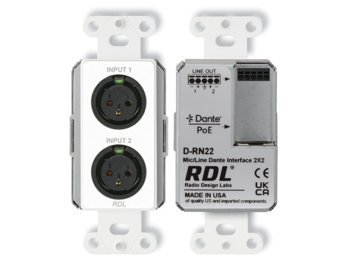 The D-RN22 is a complete wall-mounted Dante or AES67 audio network interface. It features two XLR mic or line inputs on the front panel and two balanced line outputs on a rear-panel detachable wiring block. The module is configured and adjusted using RDL CONSOLE or other network control software. The D-RN22 fits a standard US single-gang electrical box or can be used with the RDL EP-1 adaptor for mounting in EU/UK square back boxes with 60 mm distance screw hole mounting centers. The D-RN22 is PoE powered and is available in multiple finishes with optional customized graphics.