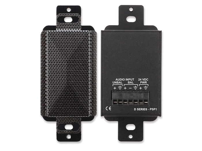 The D SERIES-PSP1F is a compact active loudspeaker that delivers rich, detailed sound in Decora-compatible wall or chassis mounts. The input accepts either a -10 dBV unbalanced or a +4 dBu balanced signal on the rear-panel detachable terminal block. Amplification is provided by a high-efficiency Class D power stage with audio filtering tailored for crisp, pleasant audio clarity. The high-efficiency Class D output stage produces negligible heat for all levels of expected voice or music modulation. The amplified output level is set by the installer using a volume control located behind the speaker grill. The PSP1F includes an analog compressor/limiter that makes higher average sound output levels possible without clipping.