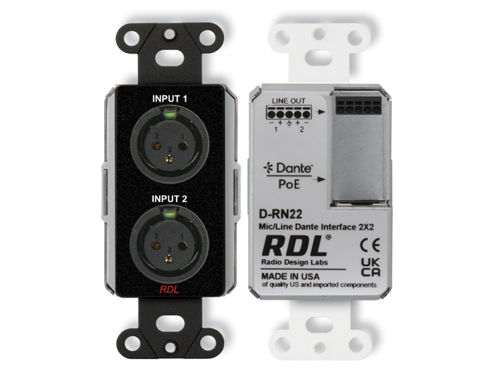 The DB-RN22 is a complete wall-mounted Dante or AES67 audio network interface. It features two XLR mic or line inputs on the front panel and two balanced line outputs on a rear-panel detachable wiring block. The module is configured and adjusted using RDL CONSOLE or other network control software. The DB-RN22 fits a standard US single-gang electrical box or can be used with the RDL EP-1 adaptor for mounting in EU/UK square back boxes with 60 mm distance screw hole mounting centers. The DB-RN22 is PoE powered and is available in multiple finishes with optional customized graphics.