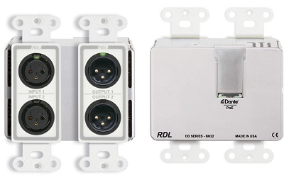 The DD-BN22 is a complete wall-mounted Dante audio network interface. It features two XLR mic or line inputs and two XLR mic or line outputs on the front panels. Special software is not required to configure the DD-BN22. Each XLR input provides three switches that may be set from the front of the unit when the cover plate is not installed. One switch enables or disables P48 phantom; the second switch selects the mic or line gain range; the third switch sets the gain. Each XLR output provides a switch to set the output to balanced professional line level or mic level. The DD-BN22 fits a standard US dual-gang electrical box or an RDL WB-2 back box for installations in thinner European or equivalent walls. The DD-BN22 is PoE powered, and is available in multiple finishes with optional customized graphics.