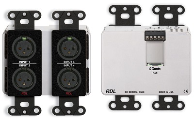The DD-BN40 is a complete wall-mounted Dante audio network interface. It features four XLR mic or line inputs on the front panels and two line outputs on a rear-panel detachable terminal block. Special software is not required to configure the DD-BN40. Each input provides three switches that may be set from the front of the unit when the cover plate is not installed. One switch enables or disables P48 phantom for that input; the second switch selects the mic or line gain range; the third switch sets the gain. Each output provides a switch to set the output to balanced professional or unbalanced consumer level. The DD-BN40 fits a standard US dual-gang electrical box or an RDL WB-2 back box for installations in thinner European or equivalent walls. The DD-BN40 is PoE powered, and is available in multiple finishes with optional customized graphics.