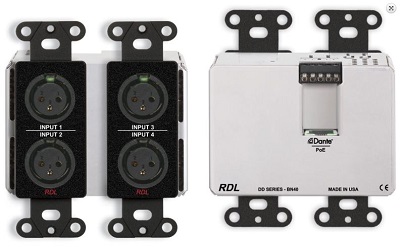 The DDB-BN40 is a complete wall-mounted Dante audio network interface. It features four XLR mic or line inputs on the front panels and two line outputs on a rear-panel detachable terminal block. Special software is not required to configure the DDB-BN40. Each input provides three switches that may be set from the front of the unit when the cover plate is not installed. One switch enables or disables P48 phantom for that input; the second switch selects the mic or line gain range; the third switch sets the gain. Each output provides a switch to set the output to balanced professional or unbalanced consumer level. The DDB-BN40 fits a standard US dual-gang electrical box or an RDL WB-2 back box for installations in thinner European or equivalent walls. The DDB-BN40 is PoE powered, and is available in multiple finishes with optional customized graphics.