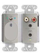 The D SERIES-BTN44 modules are Dante networked, wall-mounted audio interfaces that include bidirectional Bluetooth audio, unbalanced analog stereo or mono audio inputs and outputs, and a balanced or unbalanced line-level output. Stereo audio from a compatible Bluetooth-enabled device feeds two Dante network audio channels. Stereo audio connected to a front-panel Mini-Jack or L and R RCA jacks feeds two other Dante network audio channels.