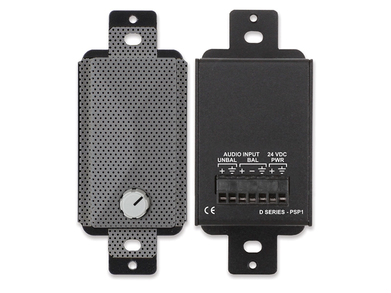 The D SERIES-PSP1 is a compact active loudspeaker that delivers rich, detailed sound in Decora-compatible wall or chassis mounts. The input accepts either a -10 dBV unbalanced or a +4 dBu balanced signal on the rear-panel detachable terminal block. Amplification is provided by a high-efficiency Class D power stage with audio filtering tailored for crisp, pleasant audio clarity. The high-efficiency Class D output stage produces negligible heat for all levels of expected voice or music modulation. The amplified output level is controlled by a front-panel volume control. The -PSP1 includes an analog compressor/limiter that makes higher sound output levels possible without clipping.