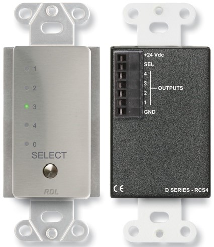 The D-RCS4 is designed to directly interface with RDL control modules, such as the RACK-UP® series RU-SX4A Audio Selector. The D-RCS4 momentary pushbutton sends a stepping signal back to the RDL control module. When connected to the RU-SX4A, pushing the button on the D-RCS4 causes the source to advance sequentially to the next input. The audio is muted during stepping to avoid annoying bursts of audio.