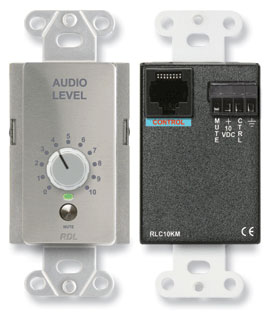 The RLC10KM is the ideal companion to RDL VCA modules where levels are to be controlled from a single remote location and pushbutton muting is desired. It is designed to directly interface with the 3 wire control input of an RDL VCA module. A single shielded pair is normally used. The RLC10KM contains a long life 10 kOhm potentiometer for setting the control voltage. The front panel has 10 graphic increments which provide a visual indication of the level setting. A MUTE button alternately mutes or un-mutes the audio in the associated RDL VCA product. An LED MUTE indicator glows red when the output is muted (0 volts dc), and turns green when the output is active (dc output voltage set by control). The RLC10KM features a standard RDL white front panel. The RLC10KMS is offered in stainless steel with custom lettering available. These finishes match other RDL remote selectors and jack plates for a visually appealing installation of multiple controls.