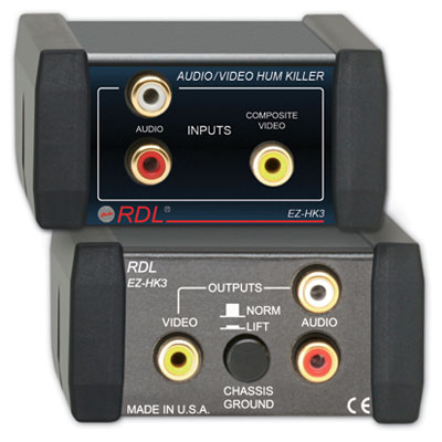 The EZ-HK3 eliminates hum due to ground loops when it is installed between an unbalanced audio/video source, such as a computer or DVD player, and the input of a grounded amplifier and video monitor or projector in an A/V system.