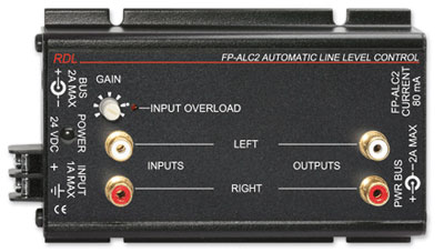The FP-ALC2 is a dual channel (stereo) module featuring phono jack INPUTS and OUTPUTS. A single user adjustment makes installation simple and efficient. The gain adjustment is set as high as possible with the loudest source without the INPUT OVERLOAD indicator flashing. No further adjustments are needed. Foreground as well as background sound systems fed from variable audio source levels, such as multiple CD changers or satellite receivers, benefit from consistent levels.