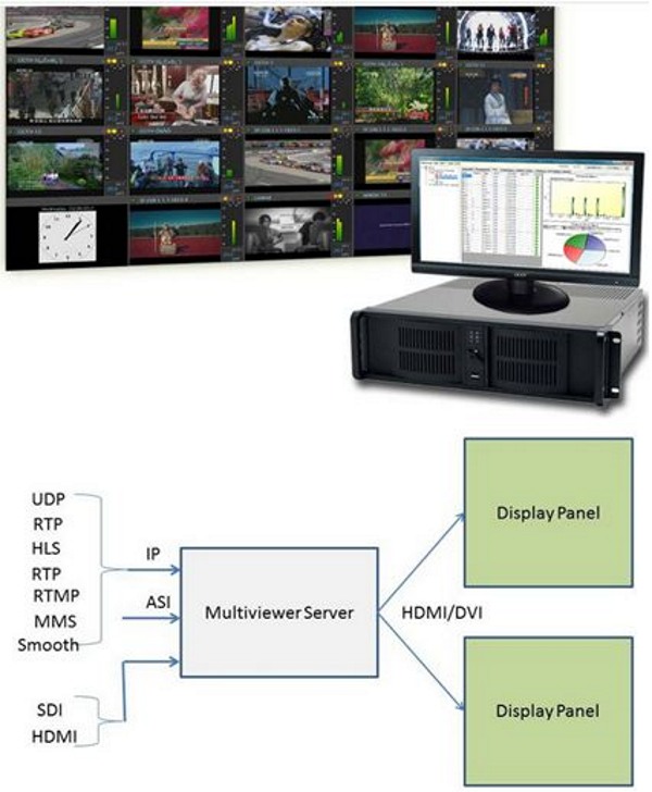 The system provides a real time view of multiple services coming from multiple transport streams. It can simultaneously display up to 50 SD video or 20 HD video programs in DVB-ASI or IP input transport streams, analyze and record the streams. Any transport stream errors are logged in a database for review and report. Alarms can be triggered by a variety of errors that can be selected by users.