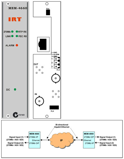 The MEM-4660 acts as a gateway between a 270Mb/s ASI or SDI, and a Gigabit Ethernet network environment.