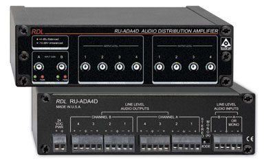 The RU-ADA4D is a four channel stereo audio distribution amplifier with input and output gain adjustments and input level metering. The module may be operated in mono to provide up to eight distributed mono signals. The inputs and outputs are connected on rear-panel detachable terminal blocks.