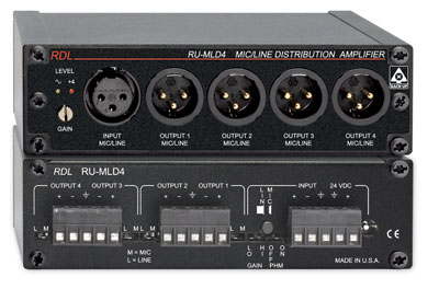 The RU-MLD4 is a four channel audio distribution amplifier. The input and all four outputs may be connected through the front panel XLR jacks or on the rear panel detachable terminal blocks. The input accepts either a balanced microphone or line level signal. Each of the four outputs provides either a microphone or line level signal. Both the front panel XLR connectors and the rear panel terminals are active at all times. The RU-MLD4 may be rack-mounted with the XLR jacks facing forward, or may be reverse-mounted using the RDL RU-FP1 Filler Panel/Reverse Mount Kit.