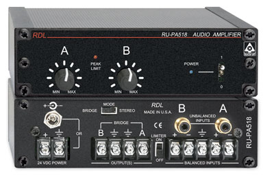 The RU-PA518 features two modes of operation: stereo and bridged mono. Depending on the mode of operation, the RU-PA518 can deliver from 5 to more than 18 watts of RMS power at the output. In stereo mode, each of the two inputs feeds its respective left or right output. Front-panel level controls set the gain for both left and right channels. When the rear-panel switch is set to the bridge mode, the two inputs (A and B) are mixed together and fed to the output. In either the stereo or mono mode, an internal audio peak limiter may be turned on using a rear panel switch.