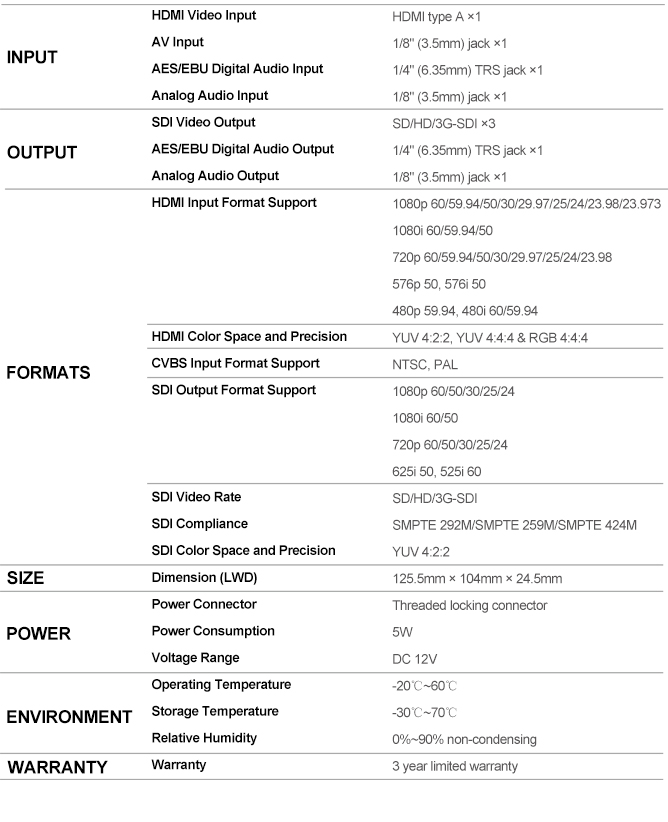 - Input: HDMI×1, AV×1, AES/EBU×1, analog audio×1