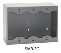 The SMB-1, 2, 3 and 4 surface mount boxes hold one, two, three or four Decora style products, including RDL remote controls and connector plates. Knockouts are provided for fastening standard metric or North American conduits to the rear of the box and to either the upper or lower surface, depending on the orientation of the box when it is mounted. The sides and top or bottom of the box maintain a smooth surface for a finished appearance superior to that of a standard electrical box. Model numbers with a suffix "W" are white; with a suffix "G" are gray to complement RDL stainless steel remote controls and plates. All SMB boxes are constructed from welded steel with a high quality powder coated finish.