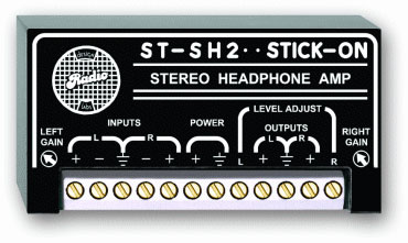 The ST-SH2 is used in applications requiring headphones of any impedance to be driven from consumer or professional audio sources. For fixed level installations not requiring user volume control, the ST-SH2 is wired to the audio source and to a headphone jack. Frequently, it is desirable to mount a volume knob by the headphone jack. The LEVEL ADJUST terminals (L) and (R) may be wired to the respective wipers of a stereo 10 kOhm potentiometer to provide volume adjustment. It is recommended that the ST-SH2 be located less than 1M from the jack and volume control.