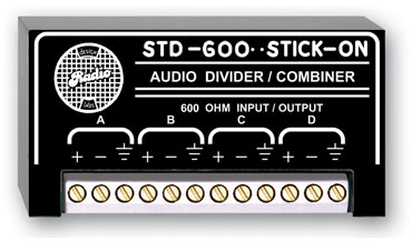 Each STD module is a resistive branching network with RF filtering on each of the four channels. Any channel, A through D, may be either an input or an output. This permits combining stereo signals into mono inputs, splitting mono signals to multiple inputs, and even combining microphones with output shorting switches into a single amplifier input. The STD modules are available in 150 Ohm, 600 Ohm and 10 kOhm models. All inputs and outputs are balanced.