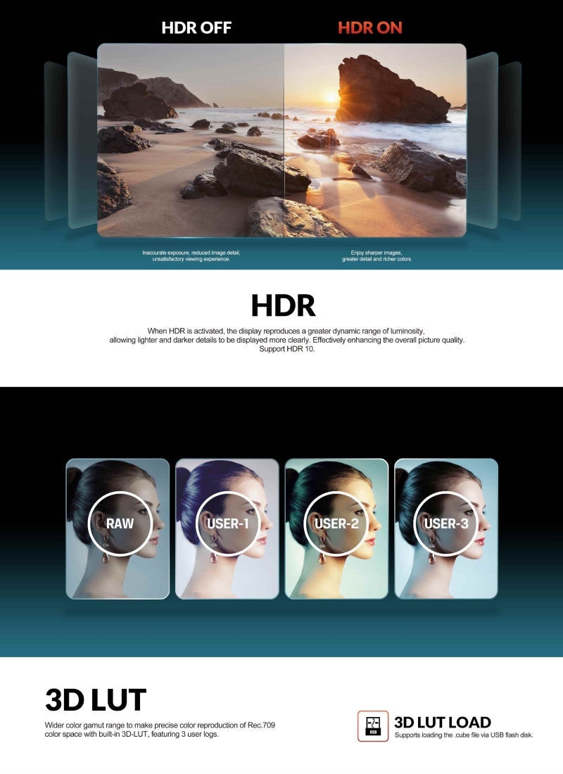 3D LOAD Supports loading the .cube file via USB flash disk.