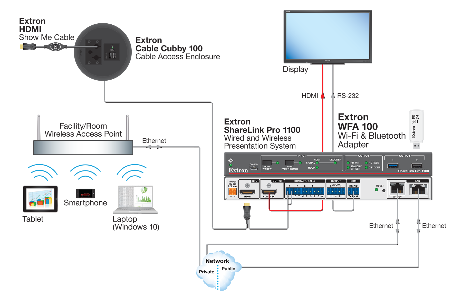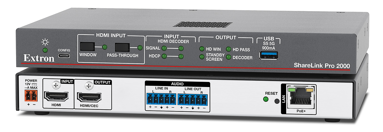 We’ve expanded our popular ShareLink® Pro line with the new ShareLink Pro 2000, a 4K Wireless Presentation System that enables anyone to present content from computers, tablets, or smartphones on a display for easy and cost-effective collaboration. It features advanced technology that supports the simultaneous display of up to four sources, including an HDMI-connected device. The HDMI input supports wired devices, such as a signage player or other AV source. The ShareLink Pro 2000 has collaboration and moderator modes that facilitate both open and controlled collaboration environments. Connect USB room cameras and microphones to the ShareLink Pro for wireless UC collaboration with popular platforms like Teams® and Zoom™. When used with Extron GlobalViewer® Enterprise software, multiple units can be managed across an enterprise or campus. The ShareLink Pro 2000 offers professional capabilities that make it easy to integrate AV and mobile devices into conference, meeting, and collaboration spaces.