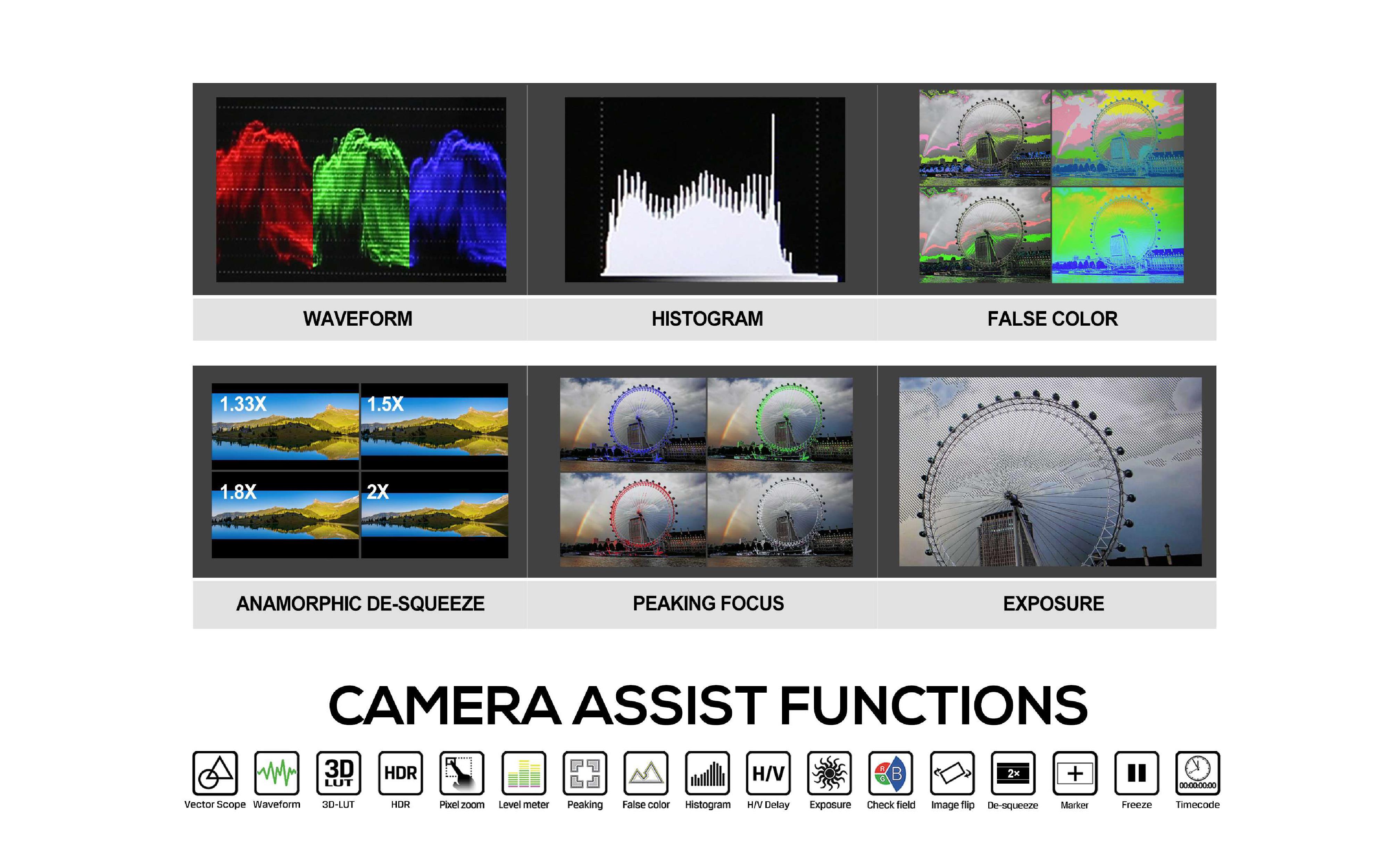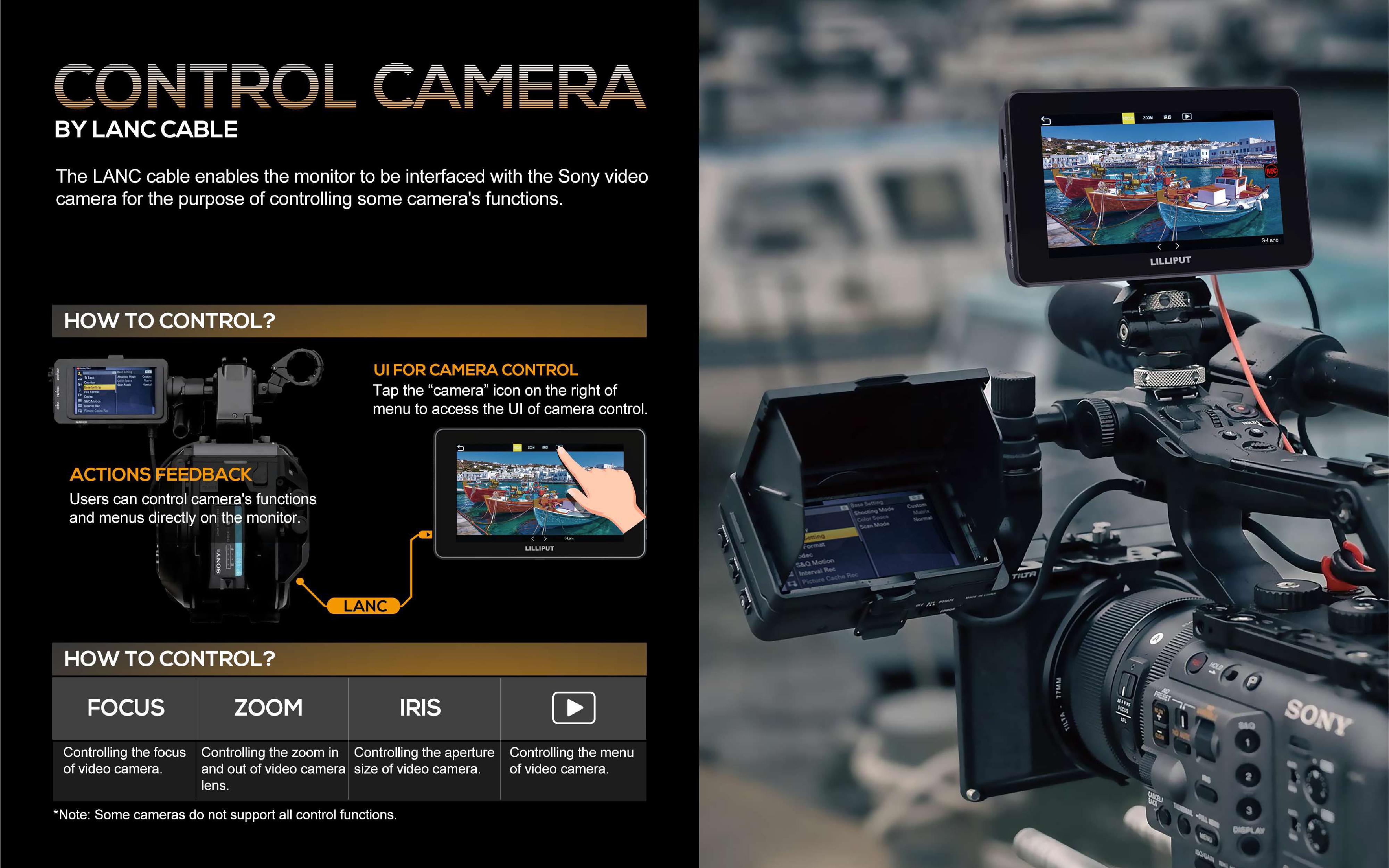 The HT5S monitor is also equipped with a speaker and headphone jack, making it convenient to use while recording. It has multiple image control functions, such as waveform, histogram, pixel zoom, level meter, peaking, false color, and H/V delay, which allow you to fine-tune your image display preferences. Additionally, it features Sony LANC Control with the included LANC cable, allowing you to control focus, iris, and zoom on select Sony cameras.