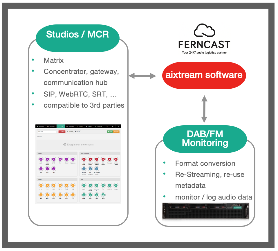 As an audio logistics company, Ferncast develops software and hardware solutions for audio workflows in broadcasting, and offers services and consulting connected to their extensive expertise. The core product is aixtream, a 24/7 software solution for OTT, DVB, SIP/WebRTC, STL, DAB, FM, Logging, Recording and more, which Ferncast continuously develops and improves. It runs as server appliance, virtual machine, containerized on AWS and other cloud services as well as on hardware.
