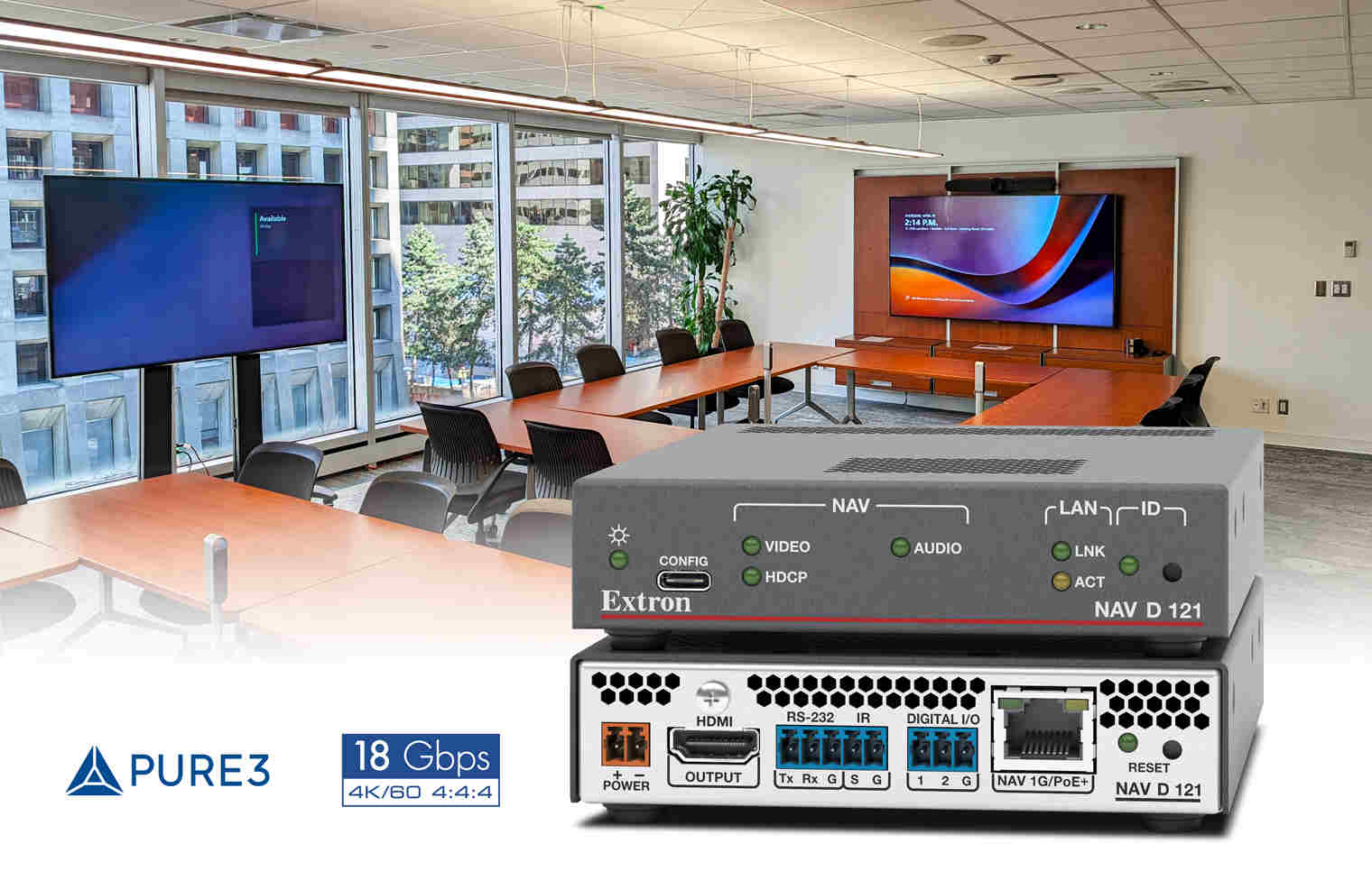 | We are excited to announce that our NAV D 121 economical and compact decoder is now shipping! This latest addition to our award-winning NAV® Pro AV over IP Series is a compact Pro AV over IP decoder that receives visually lossless video, audio, and control over 1 Gbps IP networks. Utilizing our Extron-patented PURE3® codec, the NAV D 121 delivers groundbreaking performance with high-quality video at resolutions up to 4K/60 with 4:4:4 chroma sampling and ultra-low latency.This NAV D 121 features an HDMI output, along with RS-232, Digital I/O, and IR control ports to expand control systems beyond the processor’s physical location, eliminating the need for additional control processors at the endpoints. Purpose-built to support demanding professional AV applications, the highly scalable and powerful NAV platform provides secure deployment of AV signals to thousands of endpoints. |