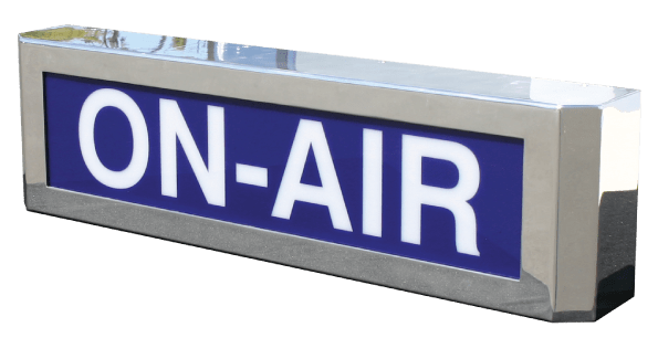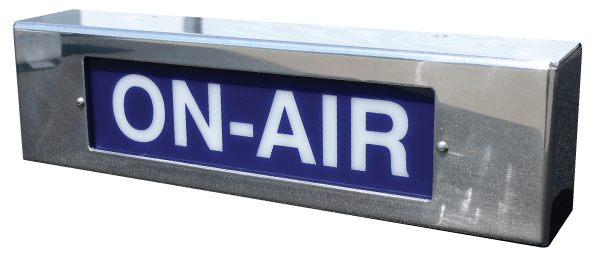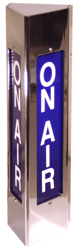 The ON-AIR Light Company’s product line consists of 4 different styles of lights, Retro, A-Frame, Simple, and Mega. Housings are formed from highly polished aluminium. Backplates for mounting are Galvanealed folded steel. Our lenses are sign grade transparent, white Lexan, and vinyl. Standard vinyl colors are Blue, Red, and Black. Standard lens legends are ON-AIR, RECORDING, APPLAUSE, and SILENCE. Custom vinyl colors, text and graphics are available as well as custom color powder coating of the housings. All lights are available with LED illumination either 12 volts or 120 volts. Retro, Simple, and A-Frame can be ordered with an incandescent light source at 12, 24, 120, or 220 volts. All lights are made in California.