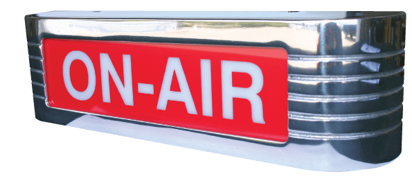 The instantly recognizable RETRO warning light is used throughout broadcasting facilities. The aluminium housing is formed by traditional sand-casting methods, machined, and then polished to a chrome-like finish. Illumination is provided by either a modern LED light strip (12 or 120 volts) or via incandescent bulb (12, 24, 120 or 220 volt). The lens is cut from sign grade Lexan with a clear lens in front for vinyl protection and visual depth. Standard vinyl colors are Blue, Red, and Black. Standard lens legends are ON-AIR, RECORDING, APPLAUSE, and SILENCE. The back plate is pre-drilled to mount to a single/dual-gang electrical back box or VESA-75 mount. Light dimensions 14-3/8″ Width x 4-1/8″ Height x 2-5/8″ Depth. Weight is 4 pounds.