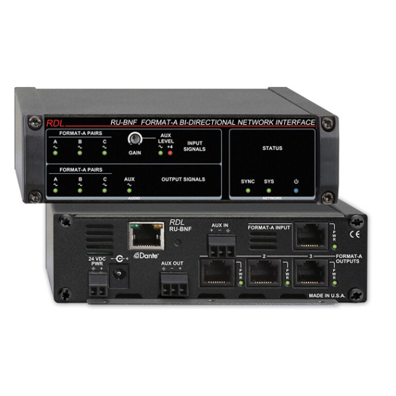 • Converts RDL Format-A and Aux Source to Four Dante Network Channels